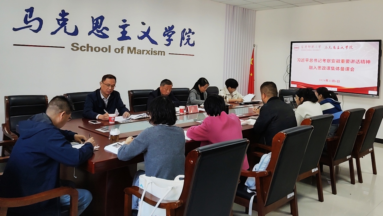 11月6日,学院“习近平新时代中国特色社会主义思想概论”教研室和“思想道德与法治”教研室联合召开集体备课会。备课会以“深入学习贯彻习近平总书记考察安徽重要讲话精神,推动思政课建设内涵式发展”为主题。校党委常委、纪委书记秦朗出席备课会,学院领导班子成员、教研室教师参加会议。
