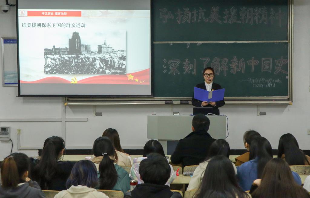 “雄赳赳气昂昂,跨过鸭绿江。保和平卫祖国,就是保家乡。”文源楼203教室里响起了昂扬的《中国人民志愿军战歌》。12月9日下午,太阳成集团tyc7111“青年新声·‘学四史’”宣讲团开展“弘扬抗美援朝精神,深刻了解新中国史”主题宣讲活动,学院团委副书记贺佳欢、宣讲团指导老师方伟出席,学院第一届青马班学员和宣讲团全体成员参加。