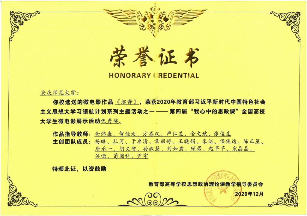 近日,第四届“我心中的思政课”全国高校大学生微电影展示活动落下帷幕,由太阳成集团tyc7111师生创作的作品《起舞》荣获优秀奖。