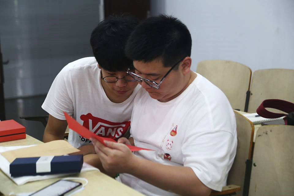 教室里的桌子上按学号摆放着一个印有“太阳成集团tyc7111”标志的帆布袋,袋子里面装着贺佳欢为学生们精心准备的礼物,一封贺佳欢写给学生的信、一封四年前班会上学生写给四年后自己的信、一个印有学生姓名的印章、一个装着书签和笔的蓝色盒子以及一枚小红花形状的吊坠,每一件物品都印有校徽和校训,旨在希望学生们在未来的日子里牢记学校的教导,时刻端正自己的行为。“吊坠是找我们学院俱乐部的同学们设计制作的,送给大家每人一朵‘小红花’,一是希望你们都能有美好未来,二是希望无论你们飘向多远,我们都不会走散。”贺佳欢说到这里已红了眼眶,几度哽咽,在座的学生也都克制不住,流下了眼泪。