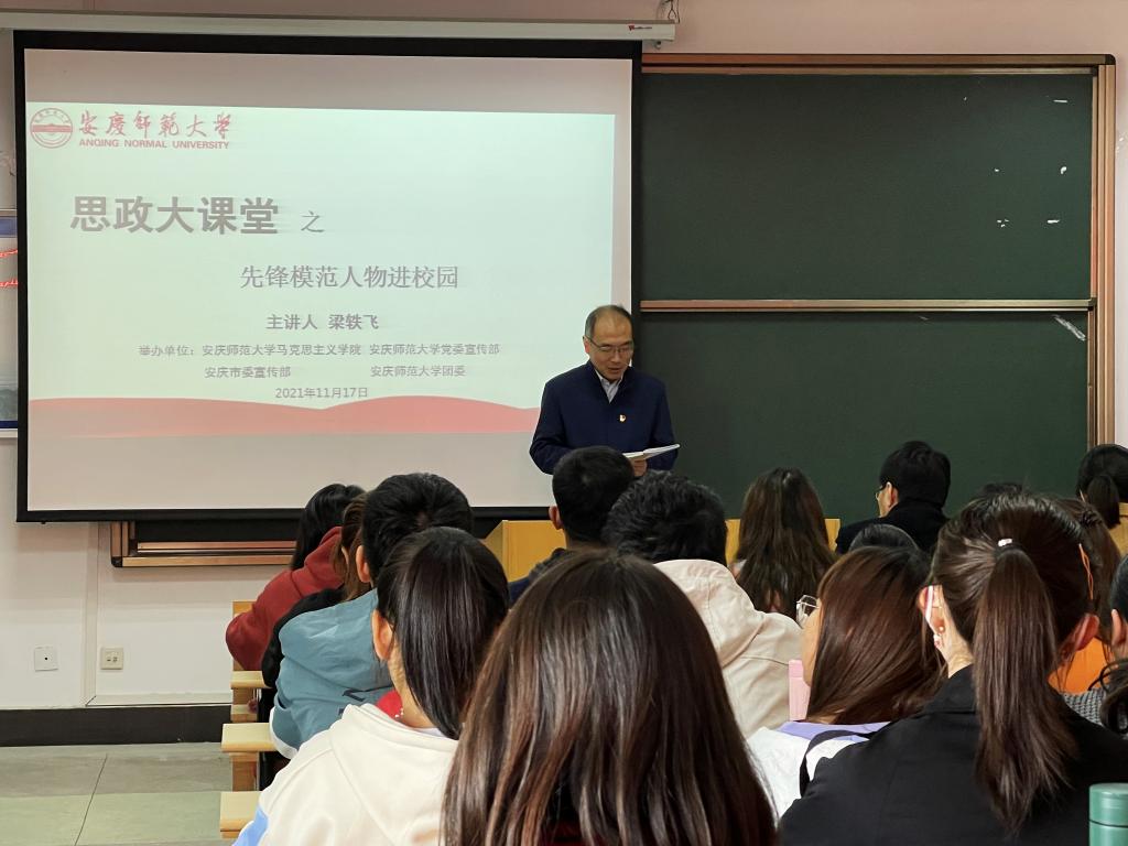 11月17日,太阳成集团tyc7111、学校党委宣传部、安庆市委宣传部、学校团委举办“思政大讲堂之先锋模范人物进校园”专题报告会。全国优秀共产党员——安徽省桐城市水利局党组成员、水利局水保工程建设管理所所长梁轶飞受邀作报告,学院党委书记金文斌、学校团委副书记赵丽丽、学院团委副书记与120多名学生代表参加本次活动。