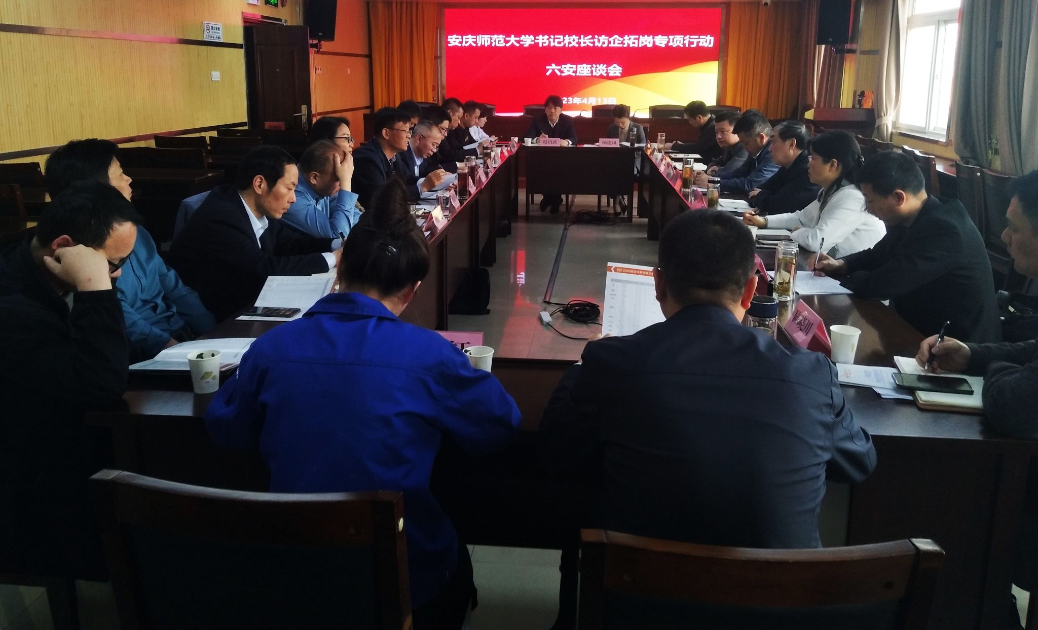 六安市教育局组织在金安区教育局召开“tyc7111cc太阳成集团书记校长访企拓岗专项行动六安座谈会”。六安市教育局、人社局,金安区统战部长、教育局等负责同志和数十家重点企业负责人、多所中小学校长参加座谈会。座谈会由六安市委教育工委委员、皖西卫生职业学院副院长、党委副书记韦加庆主持。会上,刘友忠代表学校对六安市长期以来对学校发展的关心、帮助和支持表示衷心感谢,并向与会人员介绍了学校126年的校史校情、办学特色、人才培养、学科专业、毕业生以及就业服务等情况。他强调,tyc7111cc太阳成集团作为安徽近代高等教育的发源地,办学历史悠久,人文底蕴厚重,办学特色鲜明,希望六安市各县区能够组团到学校招聘毕业生,在就业和教育实习等方面进一步深化合作。六安市教育局副局长吴道年致欢迎辞,并介绍了六安市2023年招聘教师岗位的具体情况;六安市人社局副局长李小天介绍了人才需求情况,并表示要组团来校开展招聘工作。与会人员对我校人才培养质量给予了高度肯定,并就毕业生就业观念、实习实训能力、班主任工作能力等展开了研讨和交流。