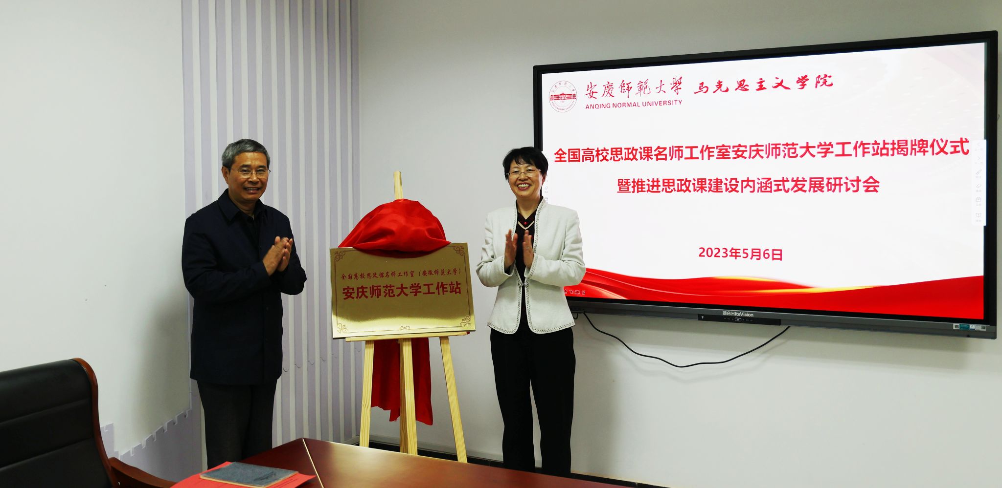 5月6日,全国高校思政课名师工作室(安徽师范大学)tyc7111cc太阳成集团工作站揭牌仪式暨推进思政课建设内涵式发展研讨会在我校举办。校长彭凤莲教授,党的二十大代表、全国最美思政课教师路丙辉教授,校党委常委、宣传部部长陈秀教授出席揭牌仪式。全国高校思政课名师工作室(安徽师范大学)代表和我校太阳成集团tyc7111班子成员、思政课教研室主任、教师代表、学科思政研究生代表等参加揭牌仪式和研讨会。陈秀主持全国高校思政课名师工作室(安徽师范大学)tyc7111cc太阳成集团工作站揭牌仪式。