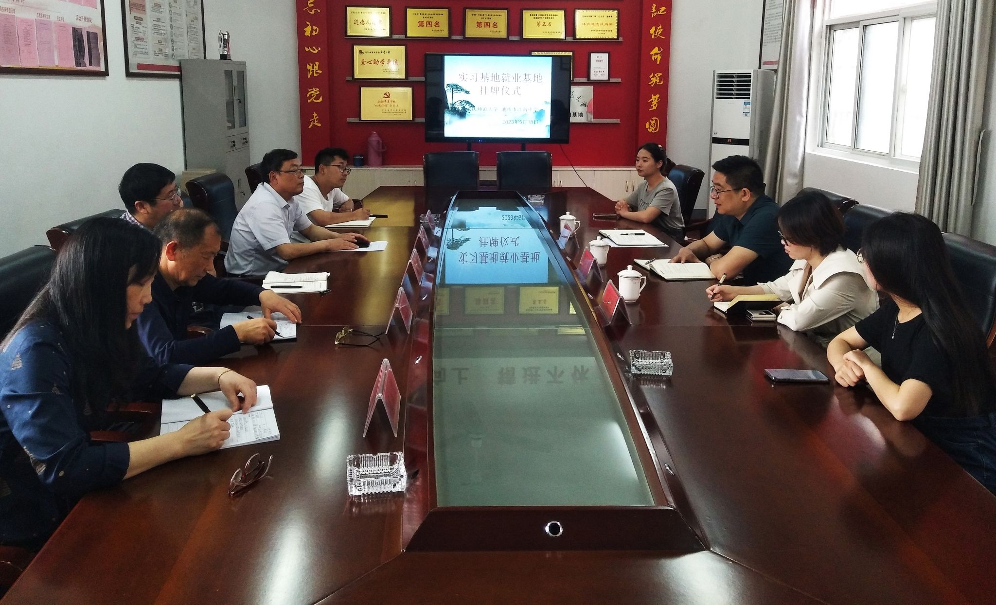 座谈会上,张俊生介绍了学院的办学特色、师资力量、专业优势和毕业生总体情况。对江南中学为学院学生提供实习岗位表示感谢,勉励参加顶岗支教的学生珍惜机会、认真备课、站稳讲台,以思政课老师“六要”的标准严格要求自己。会上,双方签订合作协议,举行毕业生就业基地授牌仪式。