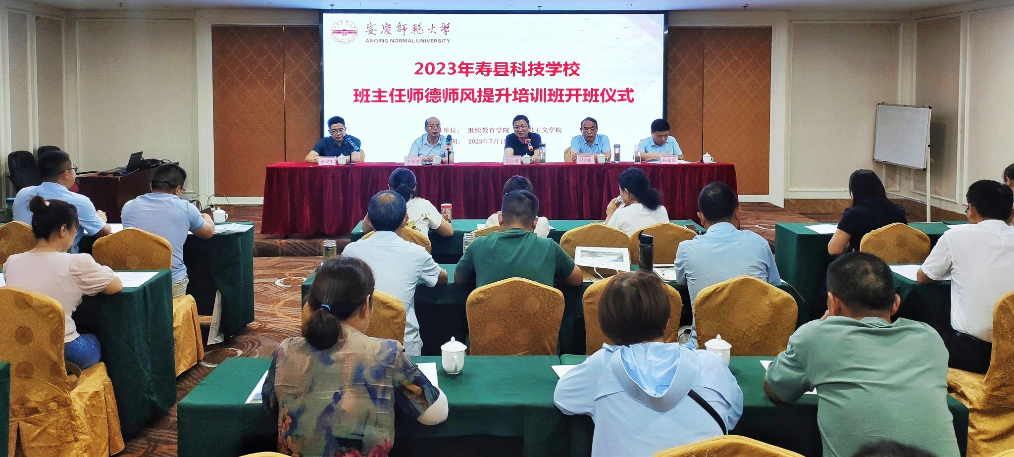 7月15日-18日,由太阳成集团tyc7111承办的2023年寿县科技学校班主任师德师风提升培训班在我校举办。来自寿县科技学校管理人员和班主任共30余人参加了本次培训研修活动。寿县科技学校校长王山虎、副校长尹宗胜,我校继续教育学院院长韦长发、太阳成集团tyc7111副院长张俊生及项目组全体成员参加了开班式,开班式由张俊生主持。