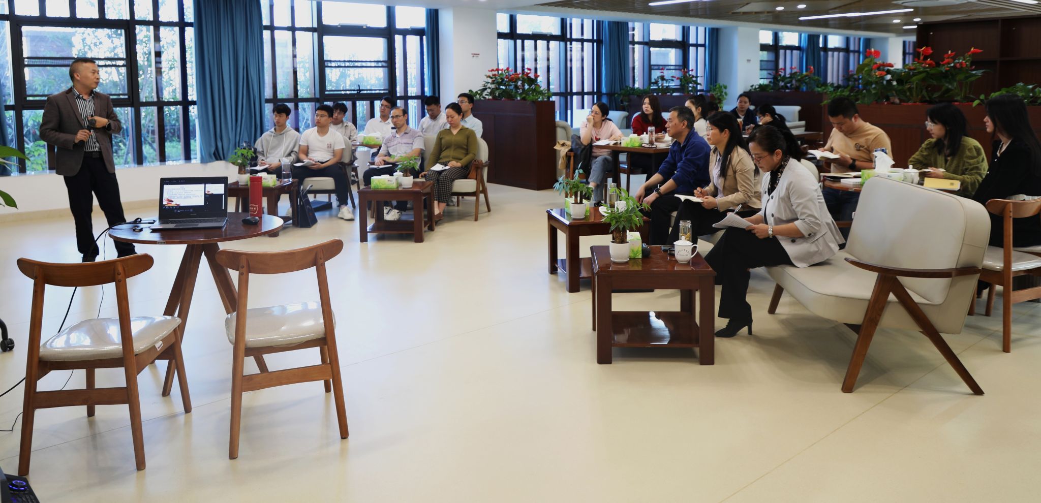 读书会上,学院副教授、硕士生导师郭祥以“延安的模范青年是什么样的”为题导读毛泽东的《五四运动》《青年运动的方向》《永久奋斗》,从青年的先锋作用、“延安青年”模范对当代青年成长、成才的启示等方面进行了深入浅出的讲解,并与在场青年教师进行了热烈的交流、交锋、交融。