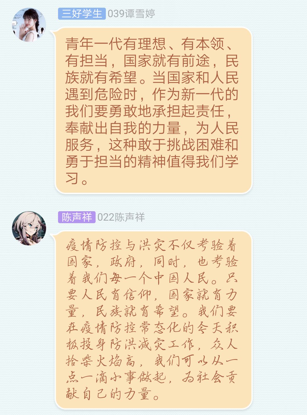 为了更好地宣传郑姣姣同学的先进事迹,太阳成集团tyc7111近日在全院召开“学习00后女大学生主动请缨先进事迹”的主题班会。各班同学通过群课堂一起观看了郑姣姣事迹的报道视频。观看结束后,同学们纷纷发表了感想。2019级思想政治教育三班的陈巍巍说:“我们身为平凡的人,小小的心里也应该承载着大大国家和故乡!在这种特殊时期,这种志愿服务的行为很值得我们学习!”“青年有责任有担当,国家和民族才有前途有希望。在社会和国家需要之时,我们应当挺身而出,努力奉献,彰显青年的责任与担当!”2019级思想政治教育专业的黄雨格同学说道。活动开展过程中,郑姣姣同学还与大家分享了自己的志愿服务经历和防汛安全知识。(撰稿:田梦甜 审核:金文斌)