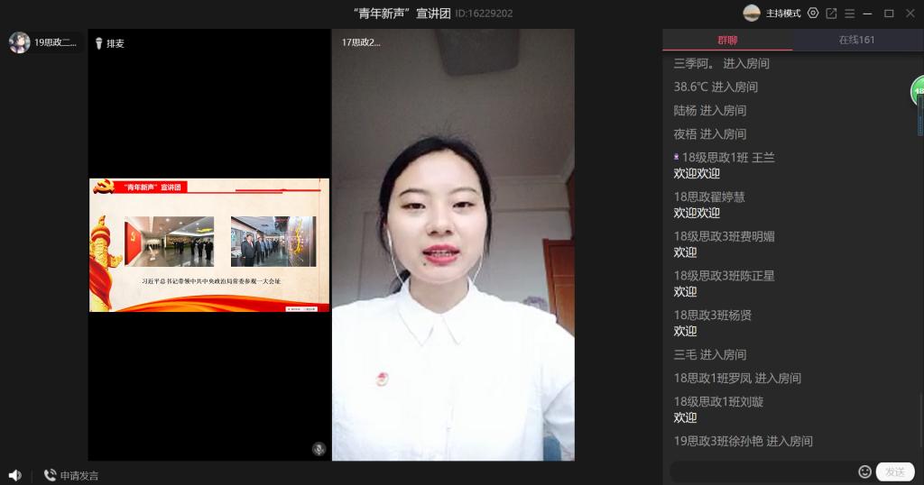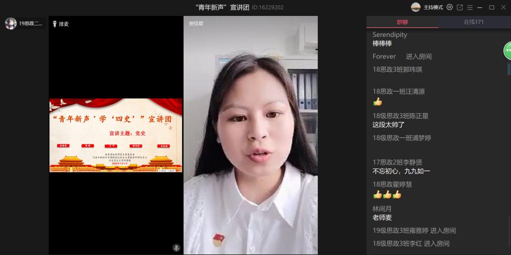 为深入贯彻落实习近平总书记关于加强党史、新中国史学习教育的重要论述,庆祝中国共产党成立九十九周年,7月1日,我校“青年新声·学‘四史’”宣讲团围绕中国共产党成立的背景及党的一大,开启“云端”第一讲。宣讲活动由太阳成集团tyc7111本科生党支部书记主持,太阳成集团tyc7111党员、研究生、本科生收看了本次宣讲活动。