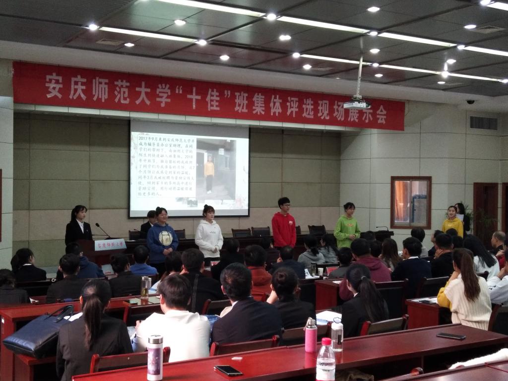 马银和钱晶同学通过PPT汇报了班级在组织建设、日常管理、党团工作、思想教育、学风建设、校园文化活动等方面的建设情况,并重点展示了班级同学参与志愿服务的情况。该班级近九成同学曾参与大大小小的志愿服务,红十字会“益行计划”、安庆市博物馆、烈士陵园、黄梅戏展演,校级支教队、社区助理等志愿服务活动中都有他们的身影。