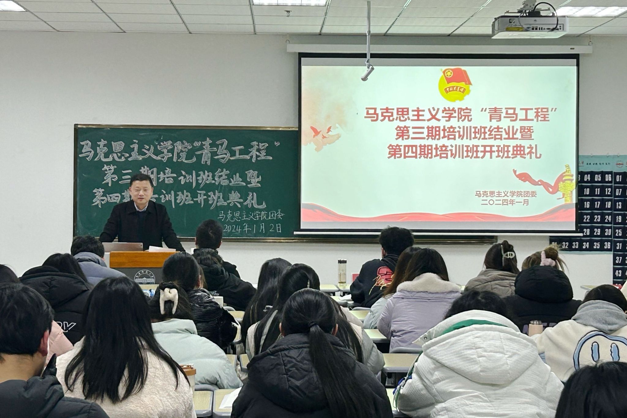 1月2日,学院举办“青马工程”第三期培训班结业暨第四期培训班开班典礼。第三期与第四期青马班全体学员参加,学院党委副书记邹斌、团委副书记田梦甜出席开班典礼。
