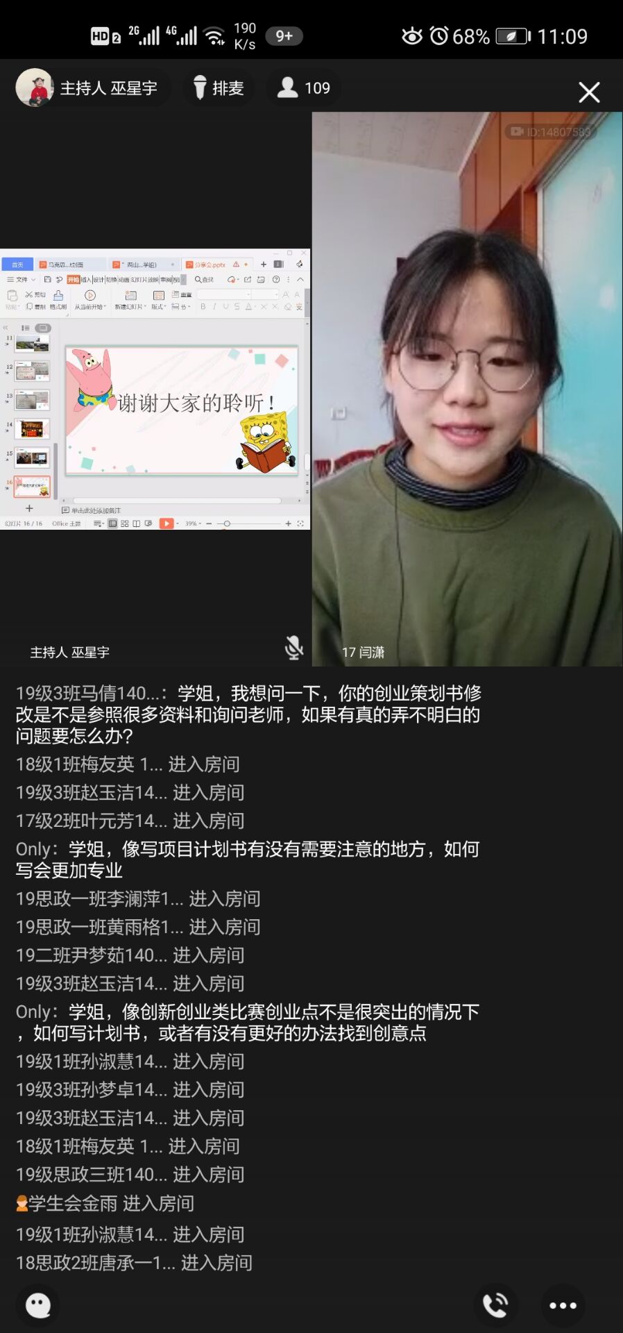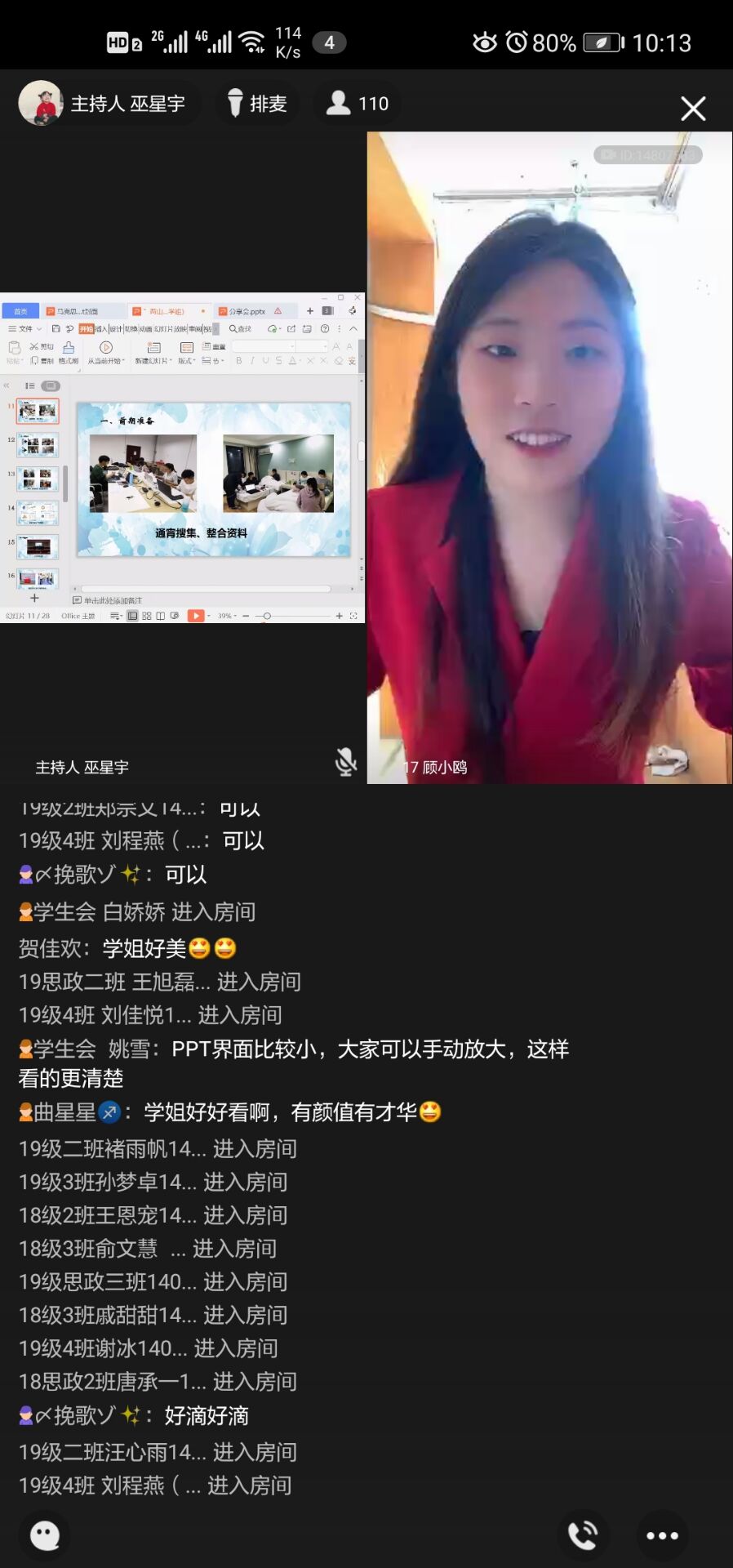 在互动环节中,顾小鸥和闫潇针对同学们现场提出的问题做出了相应的解答,思想政治教育专业2019级(3)班吴婷婷就参赛选题和调研对象的选取提出了疑问,对此,顾小鸥提出了以下建议:关注国家发展现状,阅读新闻报纸上的时事 ;浏览专题调研报告,咨询指导老师的意见。活动过程中,学生们的参与度较高,会后也收到了较好的反馈。“通过参与这场创新创业经验分享会,我掌握了很多关于创新创业方面的知识,今后也会积极关注并参与此类实践活动,从而提高自己的创新能力。”思想政治教育专业2019级(3)班的雍雅婷表示。